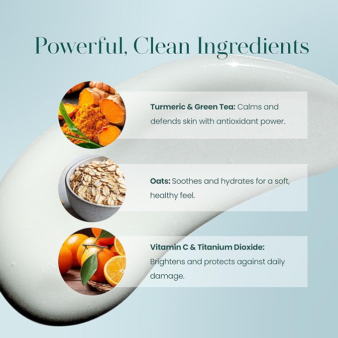 - 🌿 Clean, Vegan Ingredients: Powered by turmeric, oats, green tea, vitamin C, and titanium dioxide, this lotion features a non-toxic, plant-based formula free of parabens and preservatives—perfect for conscious skincare routines.