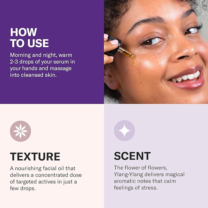 - Ingredient Power: One of the most revitalizing oils, our Rosehip Oil is full of vitamins, antioxidants, and essential fatty acids to visibly reduce signs of aging. Our Ylang-Ylang Oil pairs synergistically with Rosehip to enhance antioxidant activity, helping improve the appearance of aging skin.