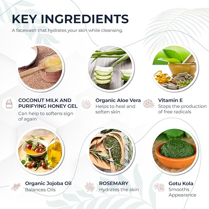 - Hydrating Face Wash For All Skin Types: Gently cleanse without stripping moisture. With coconut milk, jojoba oil, and raw honey, it nourishes and softens—ideal for dry, sensitive, or redness-prone skin, and balanced enough for oily or combination types.