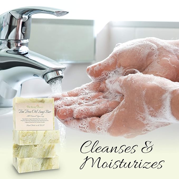 TEA TREE SOAP BAR - 4 Natural Tea Tree Oil Soap Bars for Face, Hand, Foot, Body Wash - Fights Blemishes, Itch, Body Odor. Handmade in USA with Non-GMO Ingredients. 4 Large 4.5 oz Bars