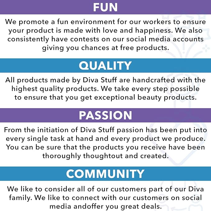 - THE DIVA STUFF GUARANTEE: At Diva Stuff, we live to create the best, most fun, and fairly priced beauty products possible. We are so confident that you'll love your Diva Stuff product that we stand by it 100%. We offer a lifetime satisfaction guarantee with each and every product we make.