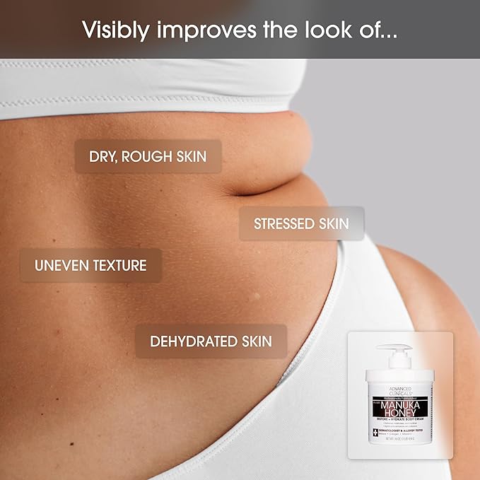 - MANUKA HONEY BODY CREAM NOURISHES & SOFTENS DRY, ROUGH SKIN – This Manuka Honey + Collagen body cream provides hydration to soothe and replenish dry, textured skin. It promotes a softer, more comfortable complexion, leaving skin visibly renewed and nourished. Suitable body cream for women and men.