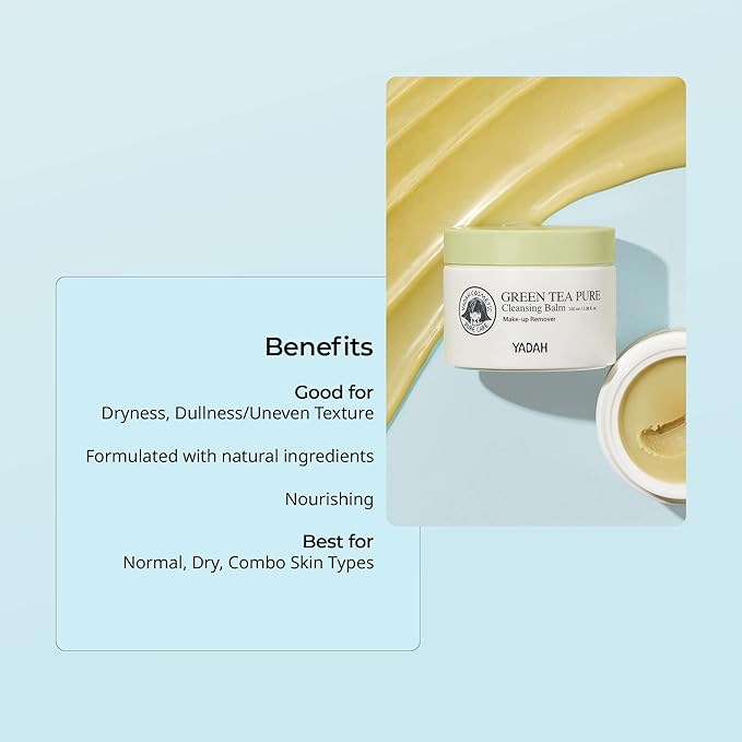 - YADAH GREEN TEA PURE CLEANSING BALM II (100ml/3.38fl oz) - This cleansing balm effectively melts away stubborn makeup and impurities without stripping moisture. Ideal for all skin types, it leaves skin refreshed, smooth, and deeply cleansed.