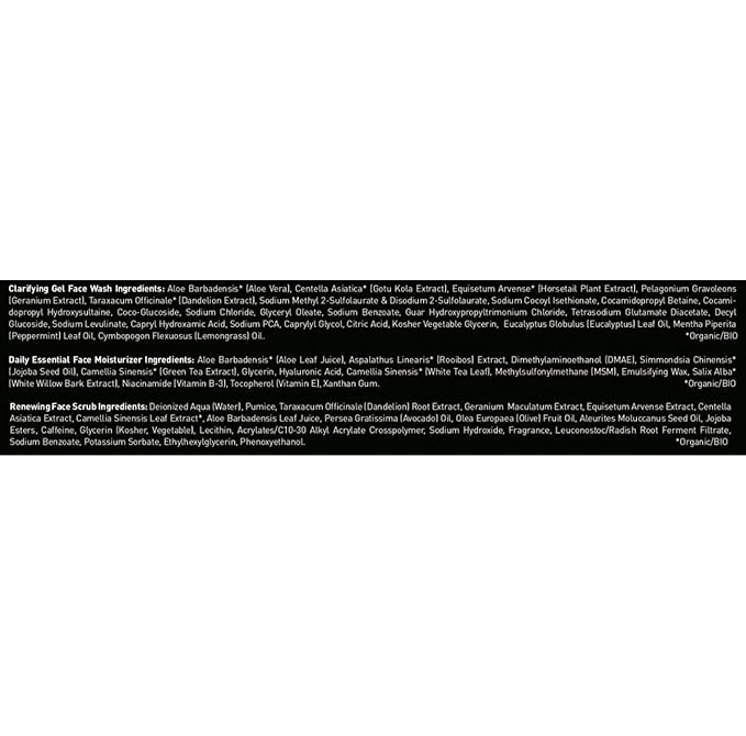 - Key Ingredients: Natural & Organic ingredients, including aloe, DMAE, MSM, hyaluronic acid, coconut cleansers, pumice, jojoba beads and green tea.