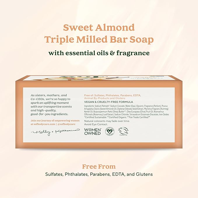 - SERENE & SOPHISTICATED: Our Sweet Almond Bar Soap is infused with sweet almond, nutmeg, and warm vanilla making you imagine stepping inside a café for a vanilla latte and warm almond croissant on a cool autumn morning.