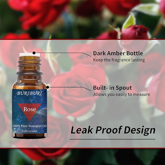 - Packing Includes: 10ml Rose Essential Oil x1, 10ml Sandalwood Essential Oil x1. With no adulterants or dilution, 100% pure quality. BURIBURI scented oil is bottled in a durable amber glass bottle.