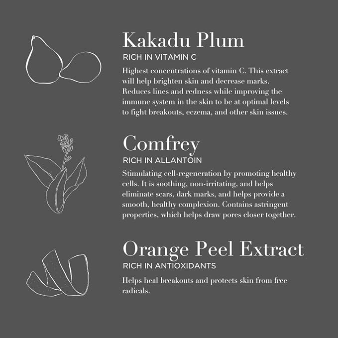 - KAKADU PLUM: Highest Concentration of Vitamin C. Helps Brighten Skin, Decrease Marks, Reduces Lines and Redness While Improving the Immune System in the Skin.