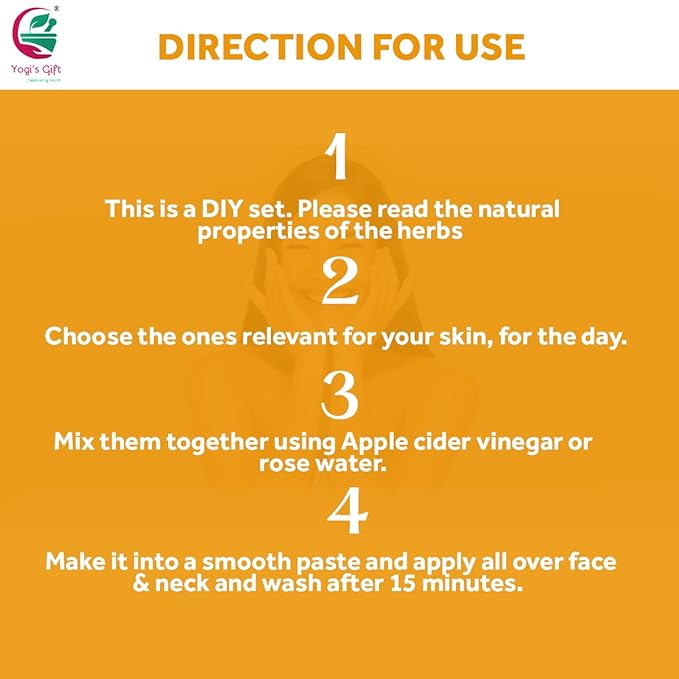 - โ ๐๐ข๐ช ๐ง๐ข ๐จ๐ฆ๐: This is a DIY set. Please read the natural properties of the herbs and choose the ones relevant for your skin, for the day. Mix them together using Apple cider vinegar or rose water. Make it into a smooth paste and apply all over face & neck. Wash after 15 minutes