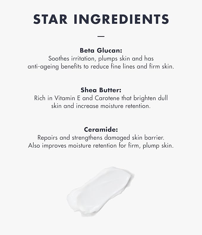 - SOOTHING & COMFORTABLE MOISTURE BARRIER - Infused with yeast-derived Beta Glucan, this cream fortifies the skin's natural moisture barrier. It contains hypoallergenic ingredients that are soothing and comfortable even from sensitive and combination skin.