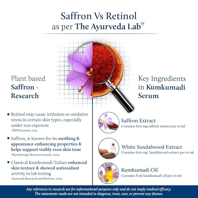 - Plant-based Retinol Alternative: Kumkumadi contains natural Saffron & Red Sandalwood extracts, that help improve the look of skin firmness, making skin apear more youthful