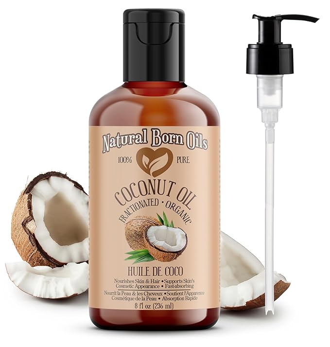 Coconut Oil Fractionated, 8oz, Organic, Cold-Pressed, Non-Greasy, Skin Moisturizer, Hair Shine Enhancer, Natural Born Oils.