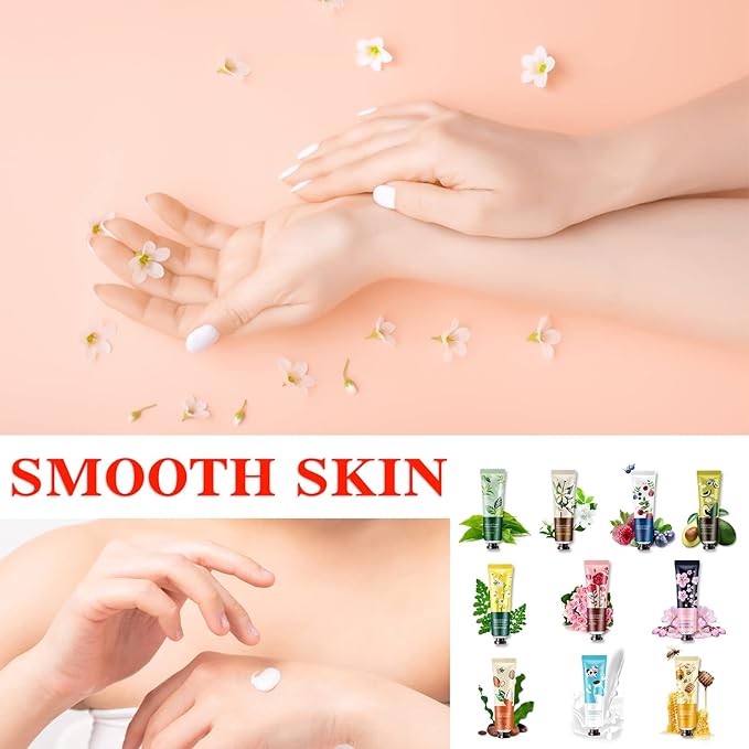 - đă10-Piece Botanical Fragrance Hand CreamăHand cream travel gift set is made with natural botanical ingredients like cherry blossom, gardenia, green tea, avocado, honey, milk, rose, moringa, berries, shea butter and more. 10 popular natural fragrances, you can choose your favorite fragrance according to your preferences and mood at the time.