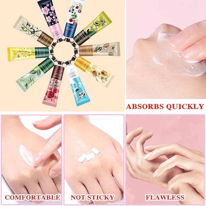 - đăEasy to CarryăThe exquisite and compact appearance of Hand cream will not take up too much space, it is very suitable for travel, 10 pieces are available, allowing you to choose any piece you like during your travels. The tube is portable, portable and easy to put in a purse or bag.