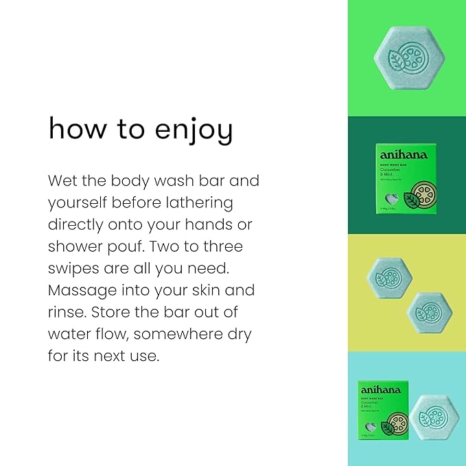 ANIHANA Body Wash Bar with Coconut Oil and Hemp Seed Oil, Soap Free, Moisturizing, Gentle, Soft Skin Care, Refreshing Cucumber & Mint Scent 2.8 Oz