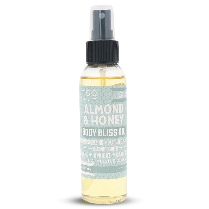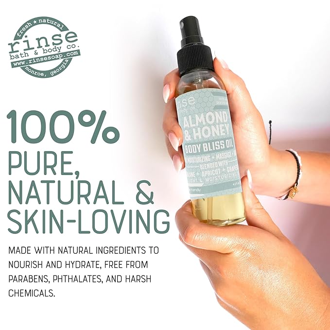 Rinse Bath & Body Almond & Honey Body Oil Moisturizer Spray - Natural, Light & Fast Absorbing | Squalane, Grapeseed & Apricot Oil | All Skin Types | Shower & Massage | Vitamin E | Handmade | 4floz
