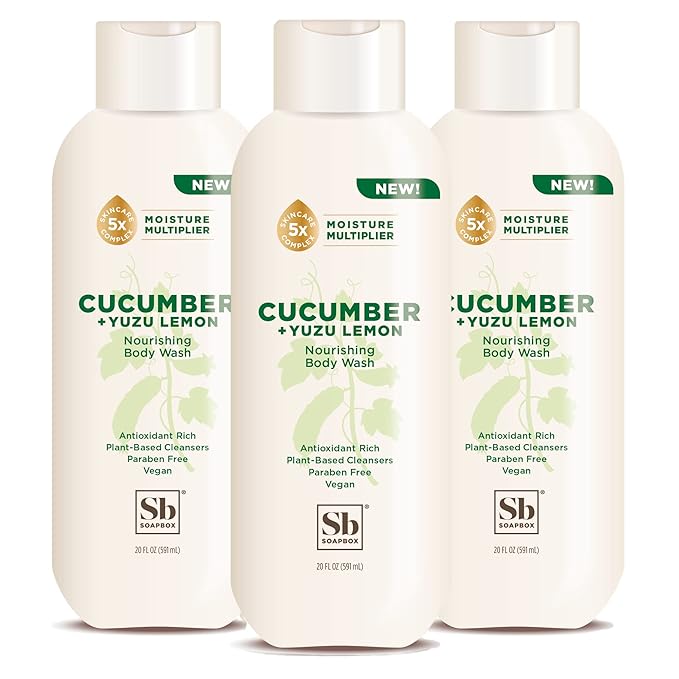 Soapbox Cucumber + Yuzu Lemon Body Wash for Women, Men, Vegan + Antioxidant Rich, Soothing, Moisturizing Soap with Shea Butter, Peptides & Keratin Promoting B3, 3 Pack, 20oz Each