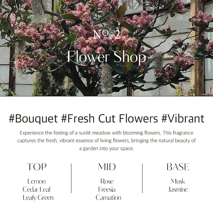 - FLOWER SHOP SCENT: Capture the essence of a bustling florist with the Flower Shop scent. This lively and fresh aroma brings the delicate scents of freshly picked flowers and green grass into your home, creating an atmosphere filled with nature's own fragrances.