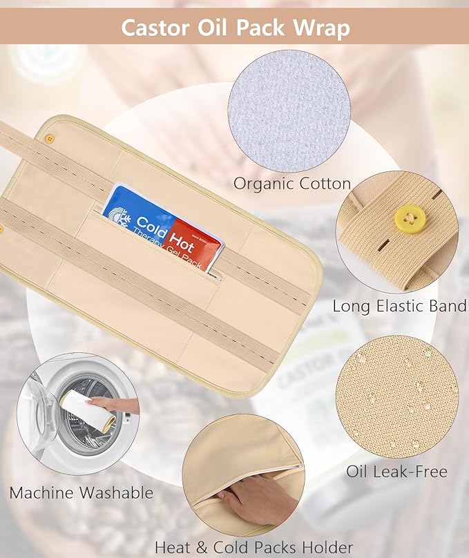 - Castor Oil Pack Wrap - The castor oil pack wrap organic cotton is crafted with premium organic materials. The caster oil pack wrap features an inner layer of soft, organic cotton flannel, a middle layer of leak-free polyurethane laminate(PUL), and an outer layer of air layer fabric provides a soft and comfortable feel. Both castor oil pack wraps for waist and neck are included.
