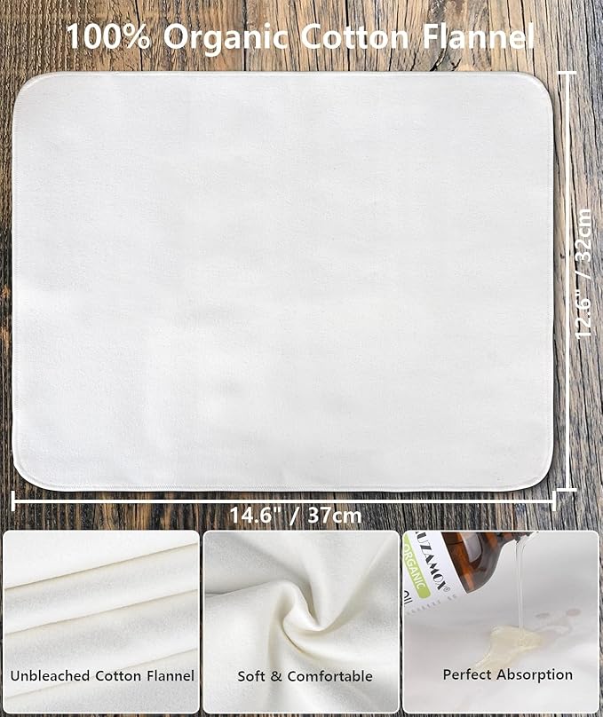 - Organic Cotton Flannel Cloth– The organic flannel cloth for castor oil is made from unbleached organic cotton flannel. The castor oil compress measures a size of 12.6" × 14.6", which can be conveniently folded and adjusted to desired sizes to accommodate various areas of the body. Saturate the oil absorbent pads with castor oil organic and apply to affected area to achieve deep penetration of the oil.