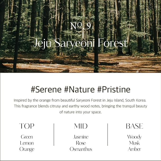 - JEJU SARYEONI FOREST SCENT: Breathe in the tranquil essence of Jeju Saryeoni Forest. Inspired by cedar trees and the subtle citrus of Hallabong, this scent captures the serene atmosphere of Jeju's forest paths, enhancing your home with the freshness of a lush forest.