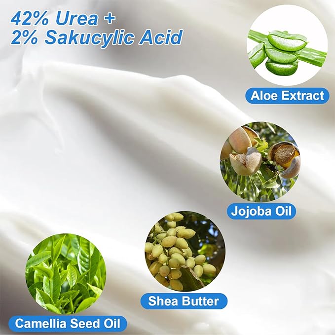 - Powerful Foot Care Solution: Our urea cream is packed with 42% urea + 2% salicylic acid, along with natural ingredients like aloe vera, jojoba oil, shea butter, and more. This foot cream is specifically designed to address foot problems, providing nourishment, moisturization, softening, and repair for dry, cracked skin, effectively relieving pain.