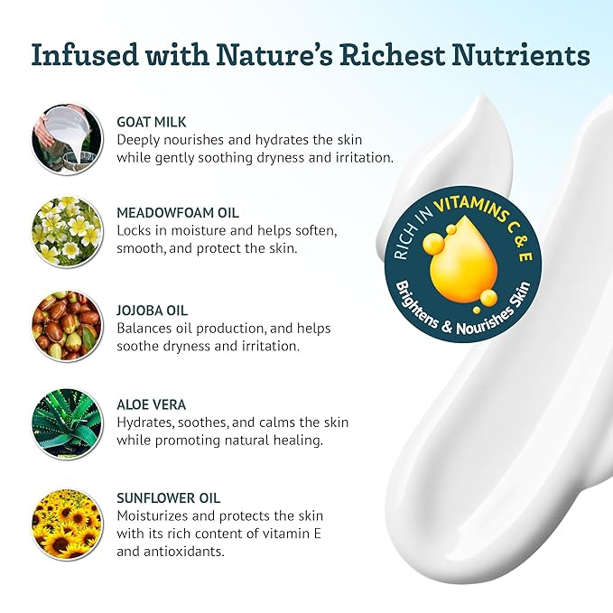 - MADE WITH GOAT MILK, ALOE VERA, JOJOBA OIL, VITAMINS E AND C - this lotion is free from parabens and sulfates. It provides gentle hydration and is an excellent choice for sensitive skin and cruelty-free skincare enthusiasts.