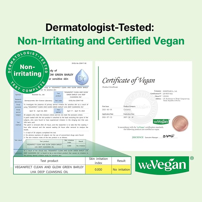 - Proven Results โ Clinical trials have shown effective cleansing performance with VEGANIFECT Green Barley Cleansing Oil: 99.27% Makeup Removal, 91.28% Impurity Cleansing, 35.24% Blackhead Reduction after a single use. Individual results may vary.