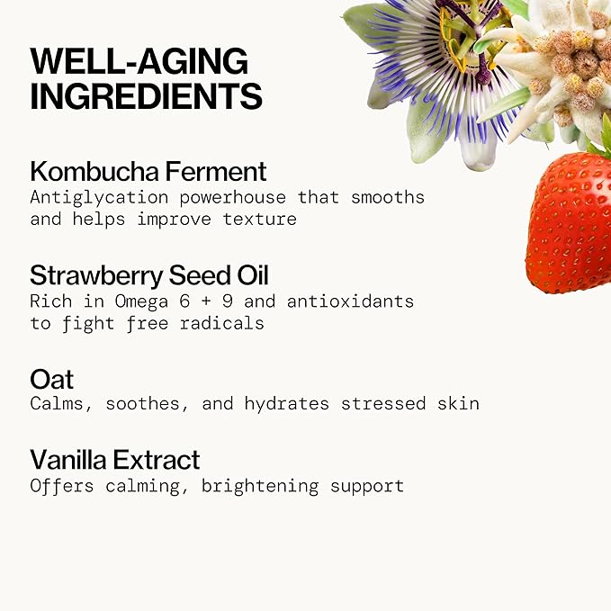 - Youth-Boosting Ingredients – Part of Pacifica’s Future Youth skincare line, this cleanser is infused with high-performance naturals. Kombucha ferment (black tea) acts as an anti-glycation superhero to smooth and improve skin texture, while strawberry seed oil (rich in omega fatty acids and antioxidants) helps protect and brighten. Soothing oat and calendula plus our exclusive Flora+Peptide complex (plant peptides + floral extracts) work together to promote a firmer-looking, radiant complexion with continued use.