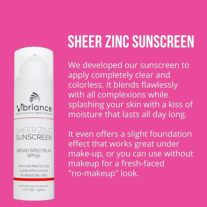 - Invisible on all complexions - Vibriance's Sheer Zinc SPF 50 Sunscreen applies completely clear, blending seamlessly with all skin tones. It offers a subtle foundation effect, making it ideal for use with or without makeup.