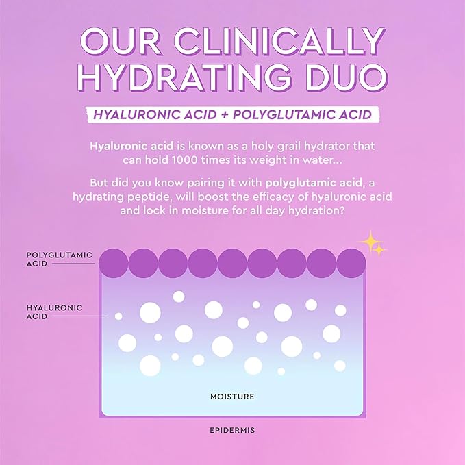 - Hyaluronic Acid - A powerful blend of multi-weight hyaluronic acids (ultra-low, low, medium, high, ultra-high molecular weights) that deeply hydrates layers of skin for plump, bouncy glowing skin.