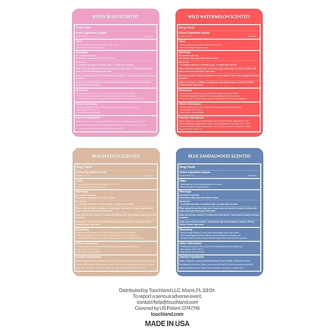 - POWER MIST DREAM 5 SET: Features 4 travel-friendly hand sanitizer mists in Wild Watermelon, Berry Bliss, Beach Coco, and Blue Sandalwood scents plus an Icy White Hand Sanitizer Mist Case. This skincare-forward hand sanitizer leaves hands sanitized, hydrated, and delicately scented while the hand mist case keeps your Touchalnd hand sanitizer within reach and complements your style.