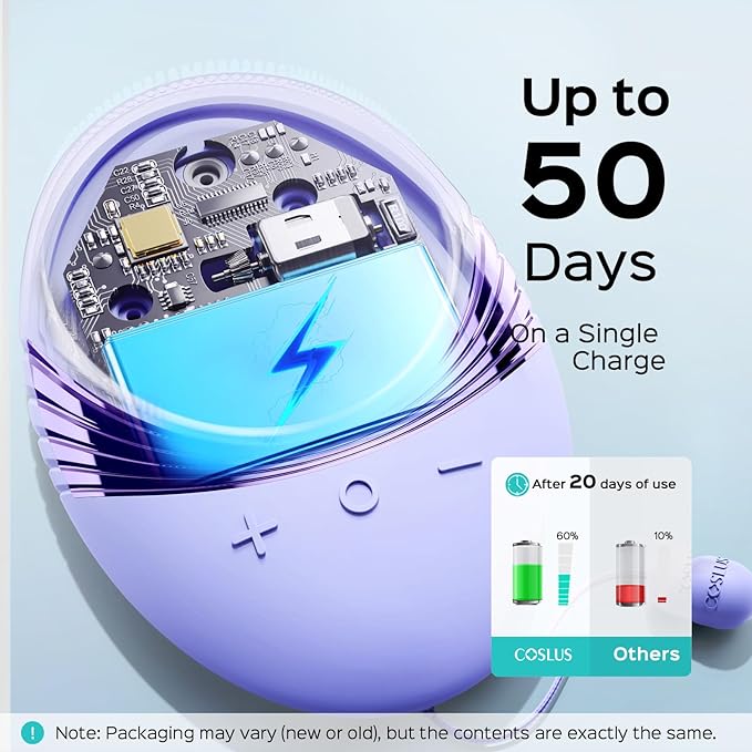 - 50 DAYS ULTRA-LONG BATTERY LIFE, USE ANYTIME ANYWHERE: The silicone face scrubber uses a powerful battery, with a battery life twice that of other products on the market. With just 1.5 hours of charging, it can be used for 50 days. Its compact and lightweight design makes it perfect for use at home or on the go, and it comes with a USB cable (adapter not included) for charging. With a super long 50-day battery life, it is truly a portable solution for your convenience while traveling