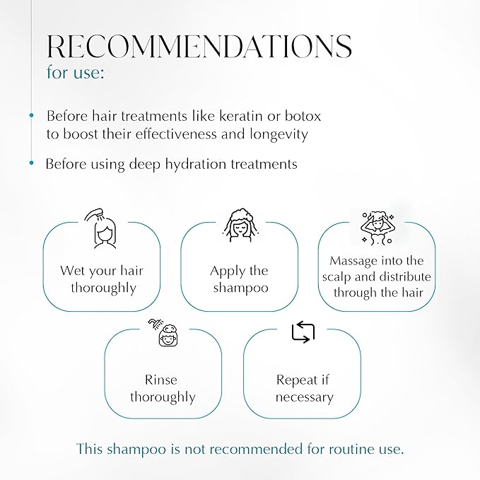 - DEEP CLEANSING AND PRE SHAMPOO TREATMENT: Our clarifying shampoo for men and women effectively removes impurities and has a dematerializing action, leaving your hair thoroughly clean and refreshed without stripping away natural oils. It's perfect for preparing your hair before deep conditioning, botox treatments, or progressive straightening, ensuring maximum absorption and effectiveness of subsequent treatments.