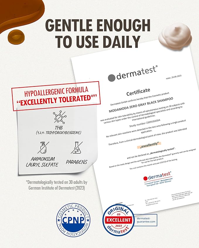 - GENTLE CARE, POWERFUL RESULTS. With its commitment to purity, ModaModa black hair dye shampoo is free from 8 harsh chemicals like silicones, sulfates, and artificial fragrances. Designed for daily use, its gentle formula ensures a soothing cleansing experience, even for the most sensitive scalps, so you can indulge in luxurious care without compromise.