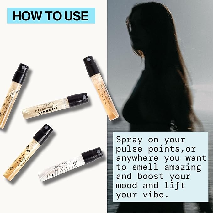 - TAKE ME THERE SPRAY PERFUME TRIAL SET includes Pacifica's 5 travel-friendly best-selling fragrances in Dream Moon, Silver Moon, Indian Coconut Nectar, Island Vanilla, and Beach Day.