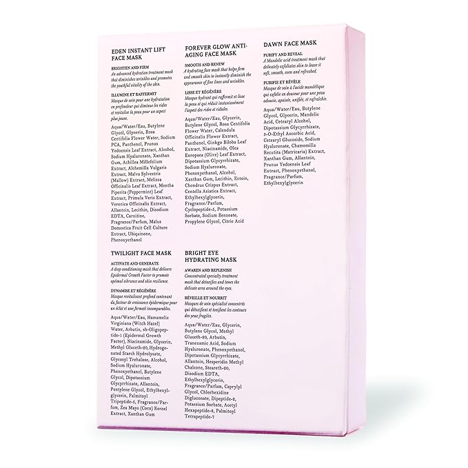 - CURATED FOR EVERY SKIN NEED – This set features Eden Instant Lift Face Mask, Forever Glow Face Mask, Dawn Face Mask, Twilight Face Mask, and Bright Eye Hydrating Mask to address daily skin concerns.