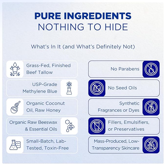 - Methylene Blue Tallow Balm for Face: Powered by grass-fed beef tallow, this nourishing face balm supports moisture retention and a smooth, healthy-looking complexion