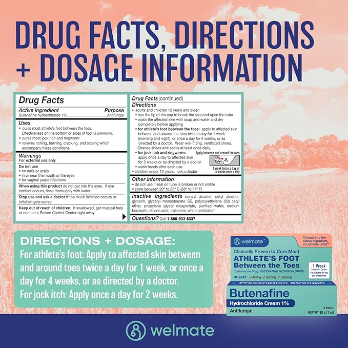 WELMATE - Athletes Foot Treatment Extra Strength - Antifungal Cream - Butenafine Hydrochloride - Relief from Ringworm, Athlete's Foot & Jock Itch - Foot Care - Nail Fungus Treatment For Toenail - 3 Pk