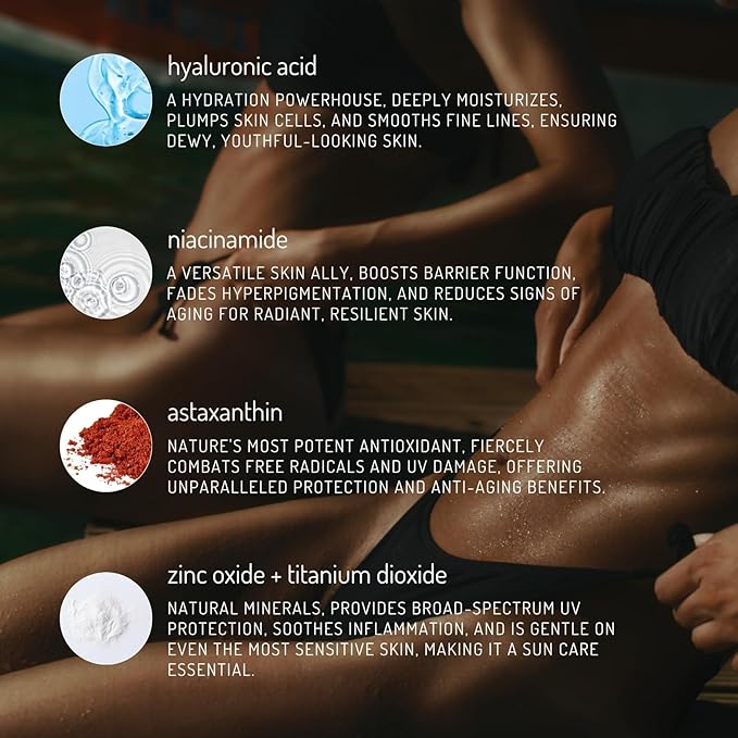 - Fountain of Youth Formula: Infused with our proprietary blend of Astaxanthin, Hyaluronic Acid, and Niacinamide, this sunscreen offers unparalleled benefits. Astaxanthin combats oxidative stress, Hyaluronic Acid provides profound hydration, and Niacinamide enhances skin texture and clarity.