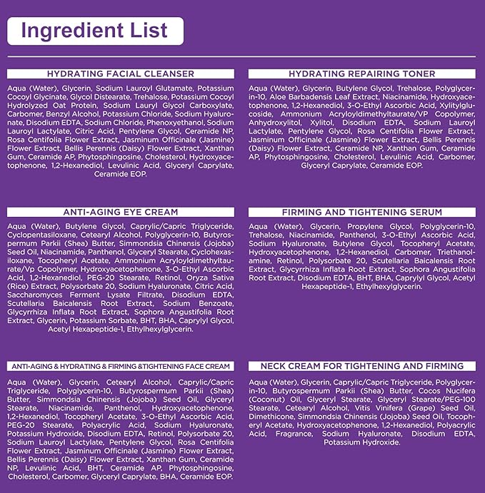 - Your Skin Care Routine Kit: This skin care kit includes everything needed for younger-looking skin.Featuring a facial cleanser,toner,eye cream,serum,face cream and neck cream.Your all-in-one skincare set for controlling oil,hydrating,moisturizing,tightening pores,smoothing,repairing,firming,lifting and anti-aging