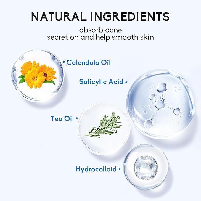 - Natural Ingredients: Our hydrocolloid bandages contain natural ingredients such as tea tree oil, salicylic acid, and calendula oil. These pimple patches for face are highly effective in absorbing gunk and shrinking spots