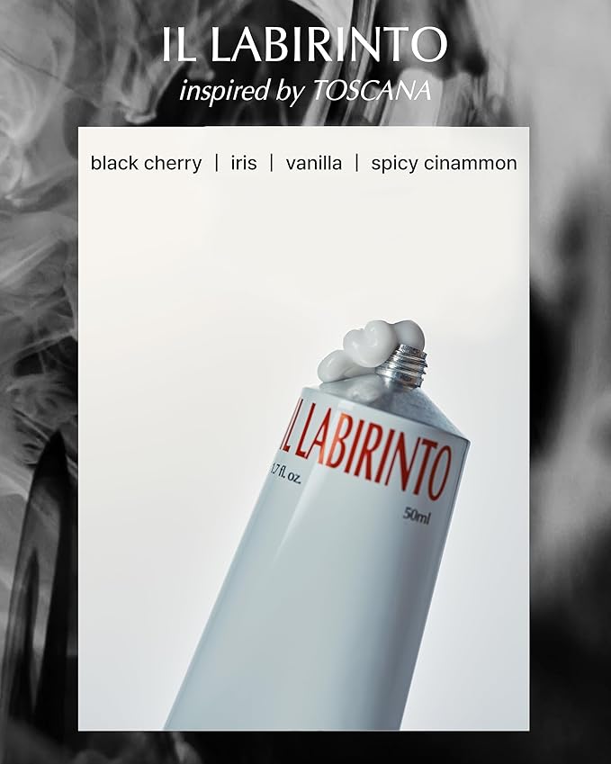 - RICH AND INTOXICATING AROMA: The IL LABIRINTO Toscana Essence Decanting Hand Cream invites you on an aromatic journey to Toscana with its rich blend of black cherry, iris, vanilla, and spicy cinnamon. This hand cream captivates with its intense fragrance, reminiscent of Toscana’s misty hills and lush landscapes, offering an escape with every application.