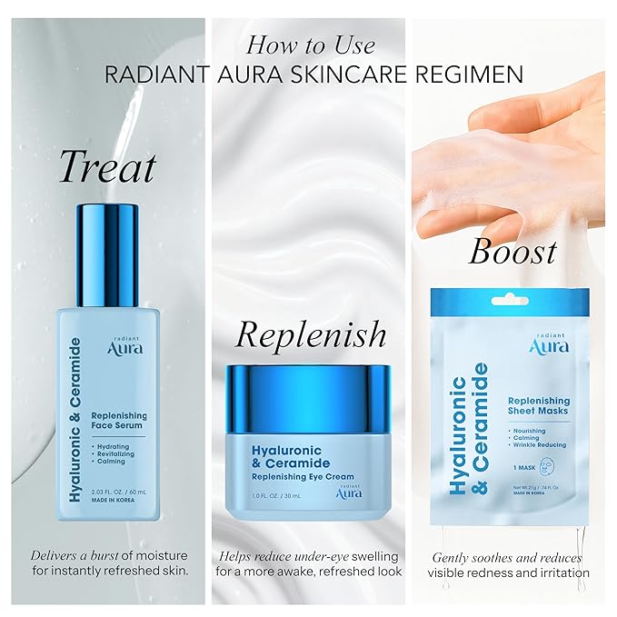 - ๐๐ฒ๐๐ฅ๐ฎ๐ซ๐จ๐ง๐ข๐ ๐๐๐ข๐ & ๐๐๐ซ๐๐ฆ๐ข๐๐ ๐ ๐๐๐ข๐๐ฅ ๐๐๐ซ๐ฎ๐ฆ: Radiant Aura premium facial serum combines the power of hyaluronic acid and ceramides. The hyaluronic acid helps to attract moisture, leaving skin feeling plump and refreshed, while ceramides strengthen and restore the skin's natural moisture barrier.