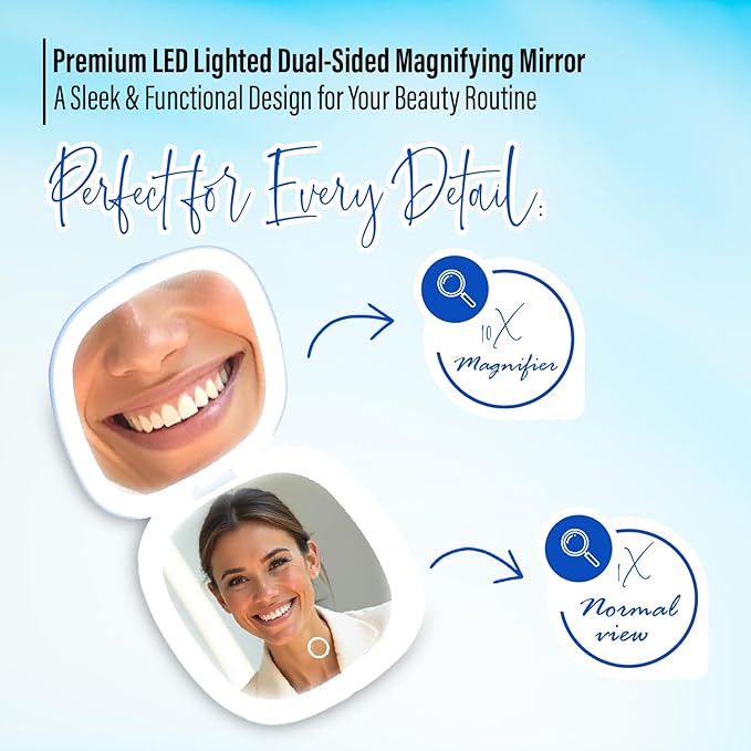 LED Compact Mirror – 1x & 10x Magnification | Travel Makeup Mirror with Adjustable Lighting | Handheld & Pocket-Sized Portable Mirror with Protective Pouch (Blue)