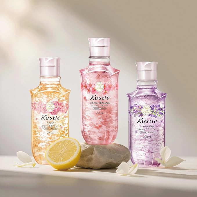 Kustie Rose Anti-Aging Body Wash, Real Petals & Rose Oil, 24H Fragrance & Deep Moisturizing, Clear Free Radicals Cleanse Perfume Shower Gel for Dry & Mature Skin, 7.4 fl oz