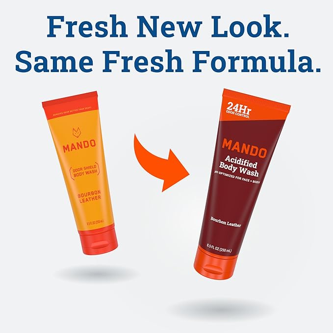 Mando Odor Shield Body Wash - 24 Hour Control - Removes Odor Better than Soap - SLS Free, Paraben Free, Skin Safe - 8.5 Ounce (Pack of 2) (Bourbon Leather)