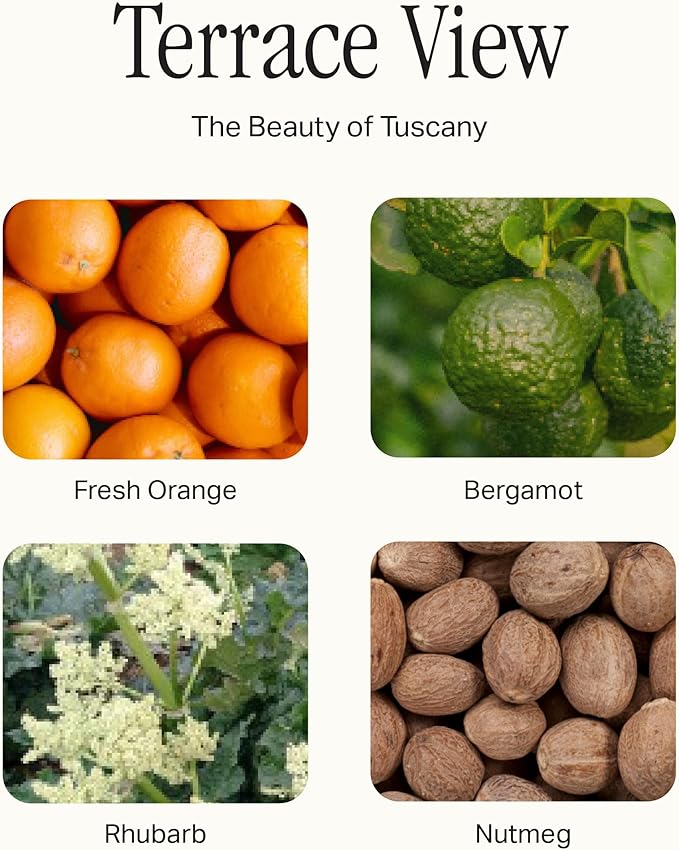 - SCENT NOTES: Terrace View captures the essence of the Italian countryside in Tuscany, blending vibrant citrus with earthy spice. Scent notes of fresh orange, bergamot, rhubarb & nutmeg