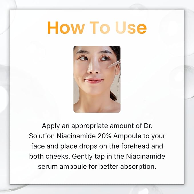 - How to Use: Apply an appropriate amount of Dr. Solution Niacinamide 20% Ampoule to your face with the pipette and drop it on the forehead and both cheeks. Gently tap in the niacinamide serum ampoule for better absorption.
