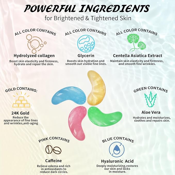 - Safe & Effective Ingredients: Our under-eye patches are infused with a powerful blend of collagen, hyaluronic acid, caffeine, and natural plant extracts which work together to deeply repair, soothe, rejuvenate, and protect the delicate skin around your eyes โ without any irritation. The ingredients of our under eye patches for dark circles and puffy eyes are vegan, sulfate-free, and gentle on all skin types.