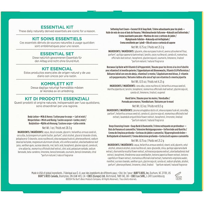 - GIFT SET: One Burt's Bees Essential Kit that includes five travel size skin care products, including Deep Cleansing Cream, Softening Foot Cream, Milk and Honey Body Lotion, Hand Salve and Beeswax Lip Balm